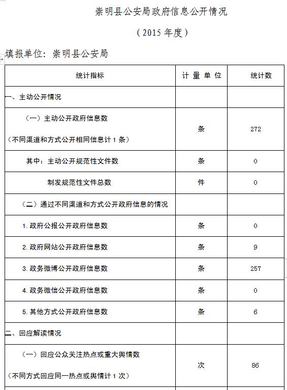 根据《规定》要求,崇明县公安局配备1名兼职工作人员,设立了1个专门的信息申请受理点,27个公共查阅点,主动为市民提供公共政府信息公开服务。目前,崇明县公安局政府信息公开工作运行正常,政府信息公开咨询、申请以及答复工作均得到了顺利开展。年度总体概况: