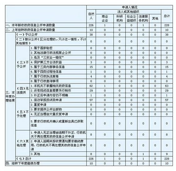 在已经答复的228件申请中“予以公开”38件、“不予公开”23件(主要涉及内部事务信息)、“无法提供”93件(主要涉及“本机关不掌握相关政府信息”和“没有现成信息需要另行制作”两类信息)、“不予处理”57件(主要涉及“信访举报投诉类申请”信息)、“其他处理”17件(主要涉及“申请人逾期未补正”的情况)。