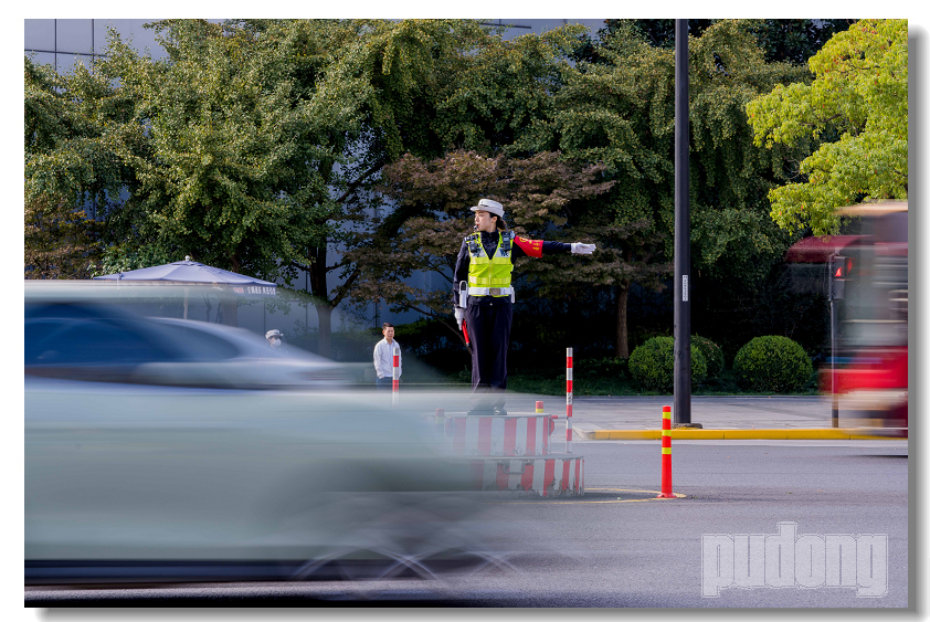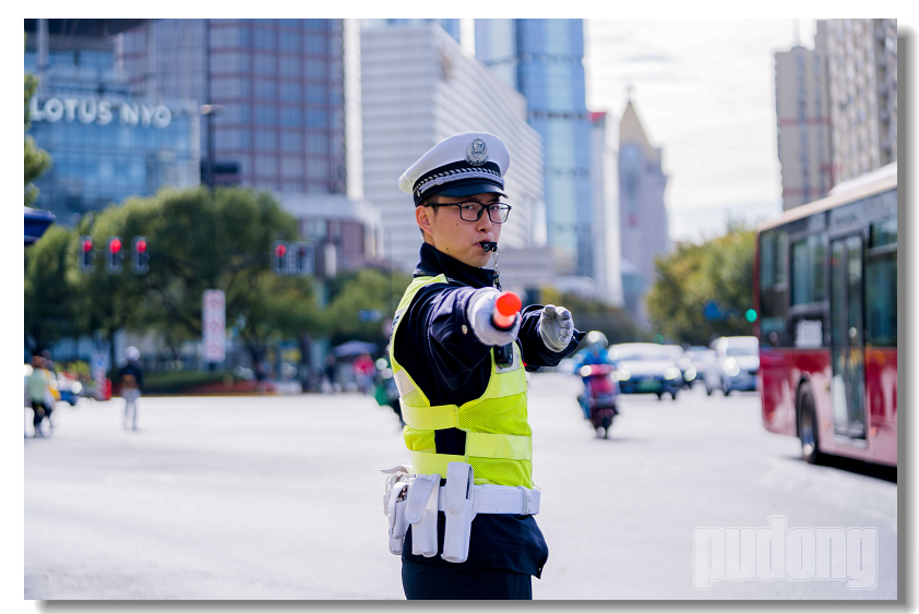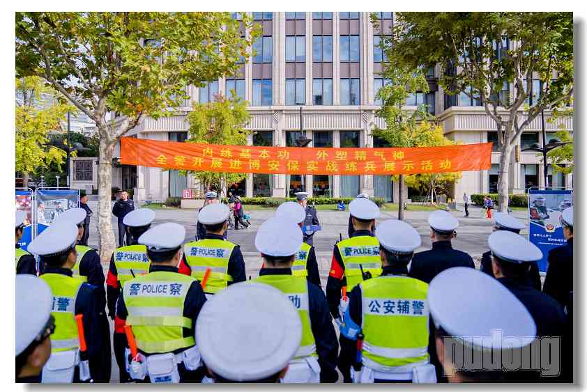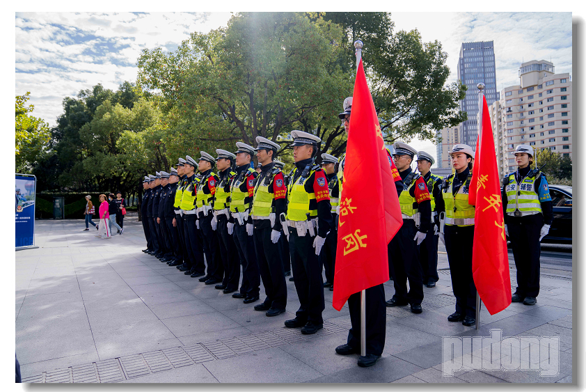 随着第六届进博会的临近,浦东公安分局交警支队为全面展示一流城市交警良好形象,向群众表示守护好道路安全的决心,举行了授旗仪式。与此同时,还有交警在重点路口岗位练兵执勤风采展示。在现场的民警们互相交流着彼此的执法执勤经验,接受市民们的监督和认可。