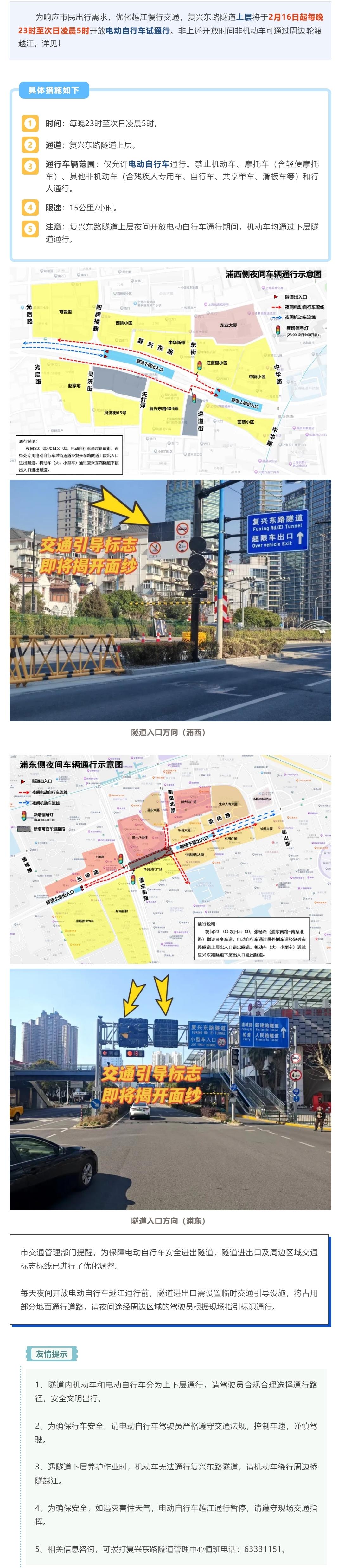2月16日起,电动自行车夜间过江可走复兴东路隧道!