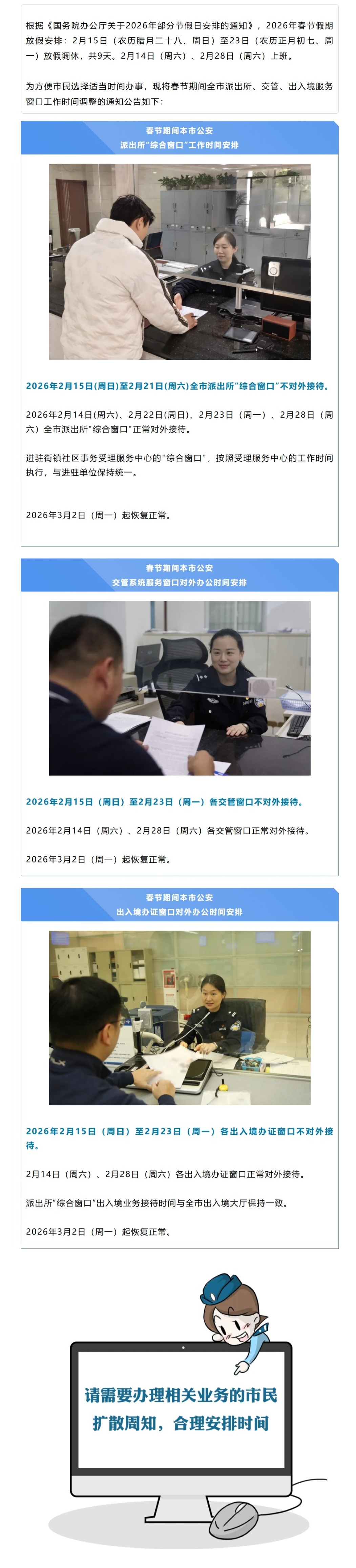 2026年春节期间本市派出所、交管、出入境服务窗口对外办公时间