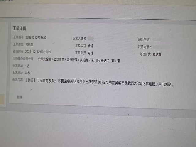 金桥派出所民警护校期间为群众找回贵重物品获12345表扬