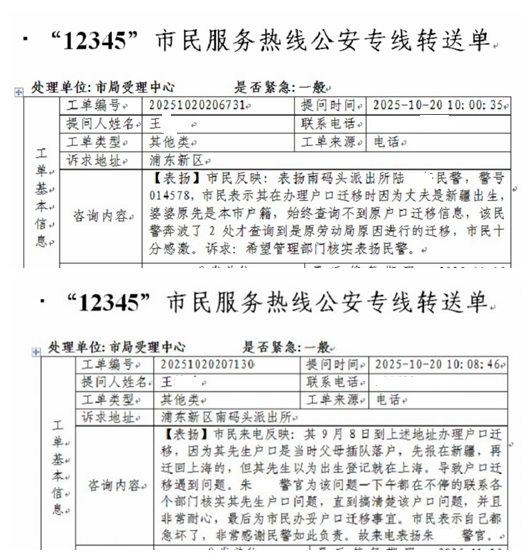 【户政业务进社区】南码头路派出所民警主动跨前,多方协调帮助群众解决户口迁移难题获市民拨打“12345”来电表扬感谢